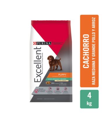 Características: En su primer año de vida los cachorros necesitan una nutrición óptima para favorecer su desarrollo y crecimiento. PURINA® Excellent® CACHORROS POLLO Y ARROZ Razas Medianas y Grandes ofrece una fórmula completa y balanceada a base de proteínas de alta calidad, incluyendo tocoferoles mezclados -fuente de vitamina E- y sin colorantes ni saborizantes arti?ciales, para garantizar la calidad nutricional de sus fórmulas y un sabor único e irresistible.