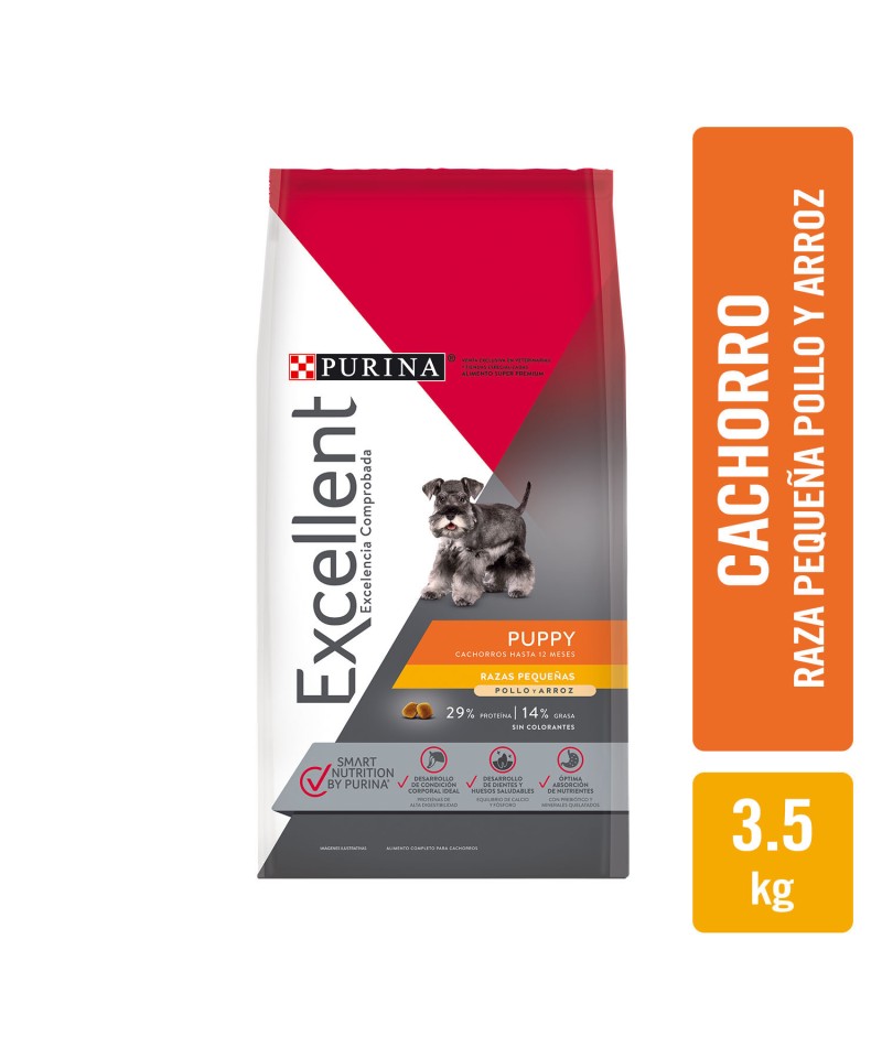 Características: En su primer año de vida los cachorros necesitan una nutrición óptima para favorecer su desarrollo y crecimiento. PURINA® Excellent® Cachorro Pollo y Arroz Razas Pequeñas ofrece una fórmula completa y balanceada a base de proteínas de alta calidad,incluyendo tocoferoles mezclados -fuente de vitamina E- y sin colorantes ni saborizantes arti?ciales, para garantizar la calidad nutricional de sus fórmulas y un sabor único e irresistible.